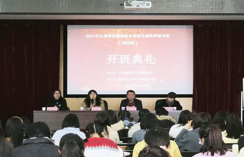 10月23日,云南省教育厅民族教育处举办的2021年度云南省民族地区乡村幼儿园教师(村幼)培训班在yl23455永利官网学前与特殊教育学院举办。云南省教育厅民族教育处调研员李宇飞,学校学前与特殊教育学院书记张大卫、副院长高春玲,昆明市教工第一幼儿园园长谭玲媚副出席开班典礼。