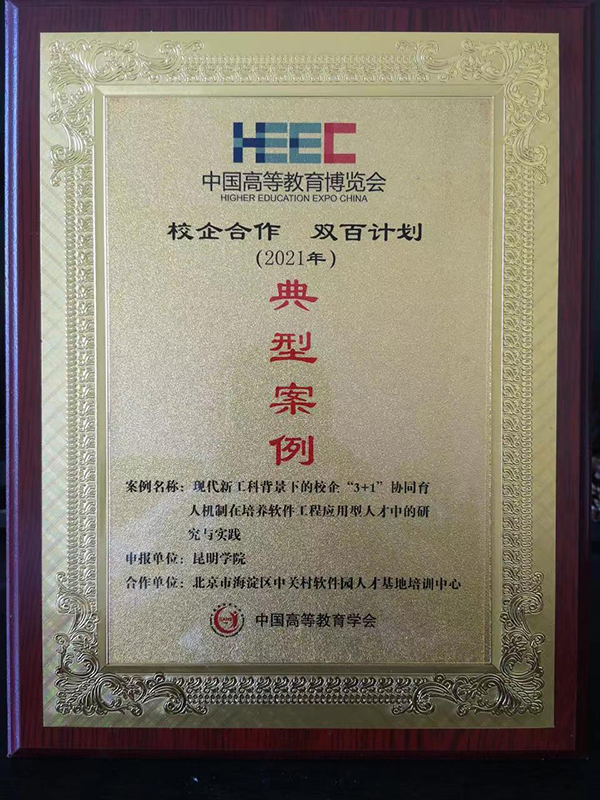 经资格审核、网络盲审、线上线下“双走访”、专家推荐以及网上公示等环节,云南省共有4所高校6项案例入选为典型案例。我校入选案例信息工程学院与北京市海淀区中关村软件园人才基地培训中心联合申报的《现代新工科背景下的校企“3+1”协同育人机制在培养软件工程应用型人才中的研究与实践》项目,基于双方在软件工程专业建设及人才培养方面多年合作所取得的显著成果,作为推广创新产教融合、校企合作的典范,成功入选专业建设类“校企合作 双百计划”典型案例,并在第57届中国高等教育博览会上获得表彰。