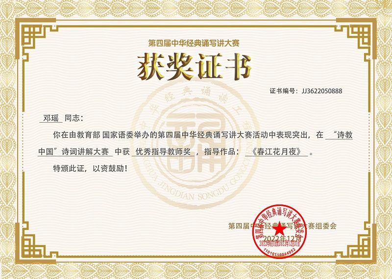 近日,教育部公布了第四届中华经典诵写讲大赛获奖名单,我校云南省国家通用语言文字推广基地骨干成员、人文学院教师张迎春参赛作品《春江花月夜》,获得“诗意彩云南” 诗词讲解大赛省级一等奖,并从全国1105件入围作品中脱颖而出,荣获“诗教中国”诗词讲解大赛全国一等奖;人文学院教授邓瑶荣获全国优秀指导教师奖;人文学院学生武彩丽书法作品《岳阳楼记》先后获得“墨香彩云南”汉字书写大赛省级一等奖、“笔墨中国”汉字书写大赛全国优秀奖,实现了yl23455永利官网参加该类比赛的历史性突破。