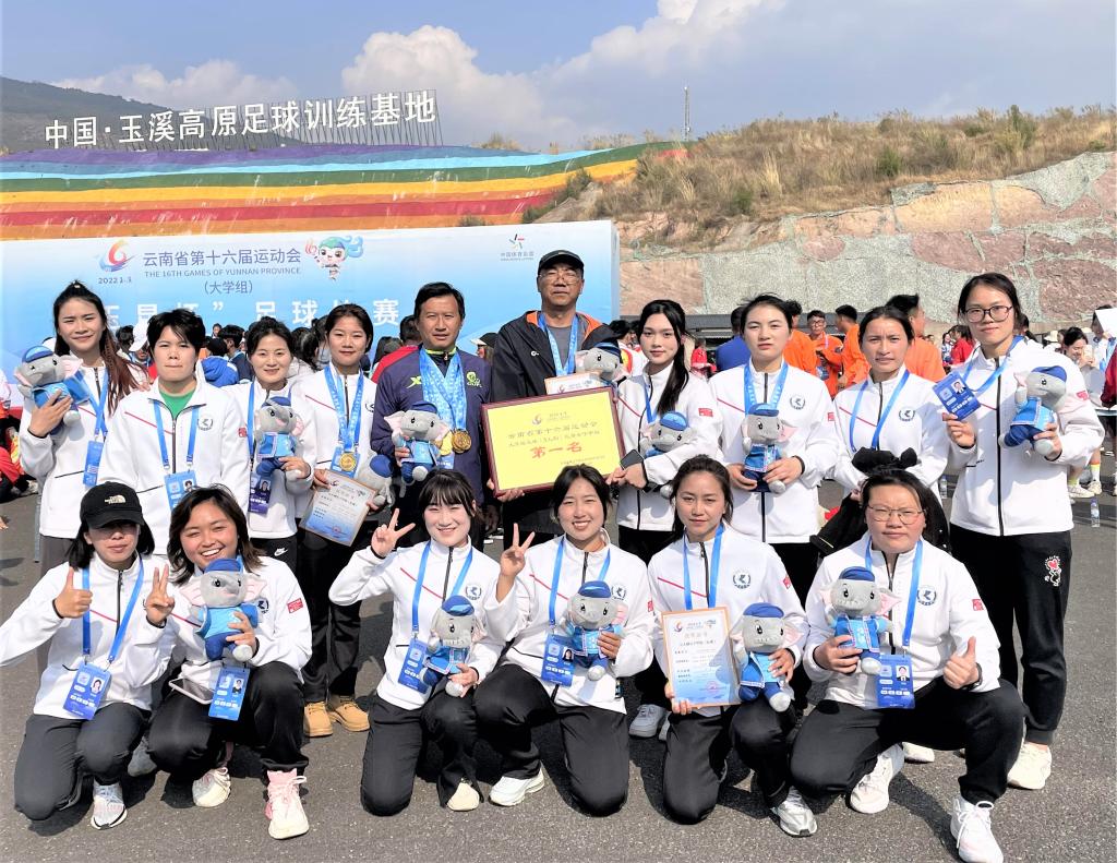 近日,云南省第十六届运动会大学组足球(5人制)比赛在玉溪举行。我校女子足球代表队战胜参赛高校代表队,荣获女子甲组冠军。