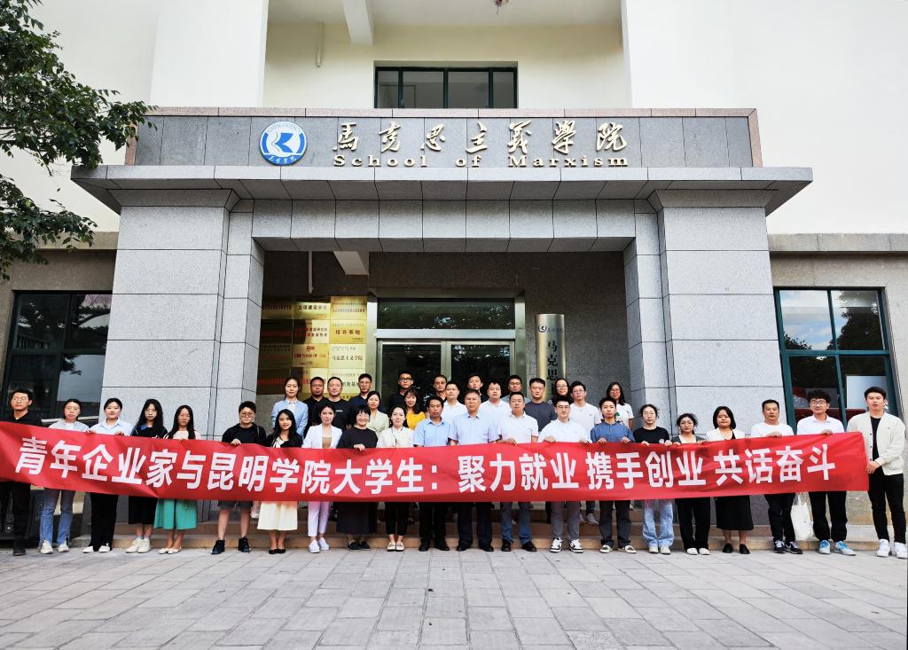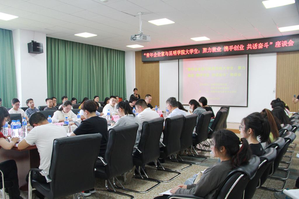 5月4日下午,在五四青年节来临之际,昆明青年企业家商会一行30多人到我校与大学生开展“聚力就业 携手创业 共话奋斗”主题交流活动,昆明市工商联秘书长张波涛等出席活动,我校团委副书记沈嘉,马克思主义学院党委书记贺笃照、副书记姚丽媛以及相关学院青年师生代表参与交流。座谈会由沈嘉主持。