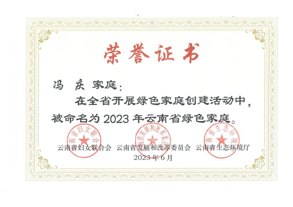 近日,云南省妇联、省发展改革委、省生态环境厅联合开展的2023年云南省绿色家庭创建示范活动结果揭晓,我校教师冯庆家庭荣获云南省“绿色家庭”称号。