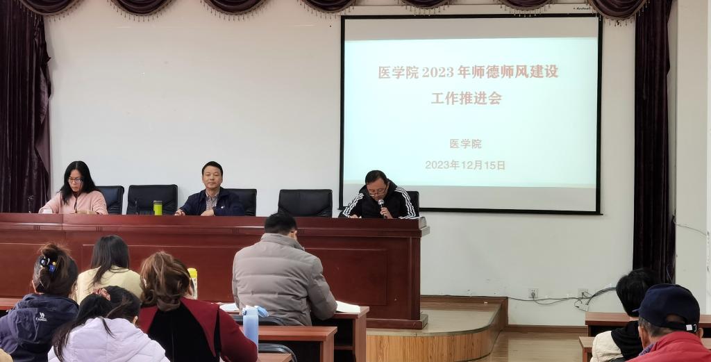 12月15日下午,医学院党委召开师德师风建设工作推进会议。学院党委书记张培宏领学了习近平总书记关于师德师风建设的重要论述,传达学习了全省教育系统师德师风建设工作推进视频会议和yl23455永利官网2023年师德师风建设工作推进会精神。医学院及校医院全体教职工参加会议。