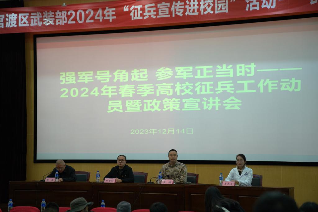 为进一步强化青年学子国防观念,激发大学生携笔从戎、参军报国热情,12月14日上午,昆明市官渡区人民武装部联合我校举办主题为“强军号角起,参军正当时”的2024年春季高校征兵宣讲会,并开展现场政策咨询活动。学校武装部负责人,各二级学院负责征兵工作的辅导员及2024届毕业班280余名同学参加。