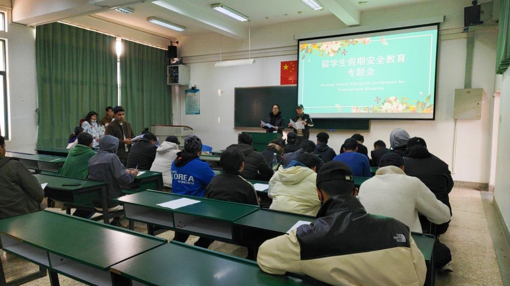 12月29日,国际学院为留学生举办假期安全教育专题教育,认真贯彻落实省教育厅高校学生安全教育管理工作调度会议精神,按照学校校园安全工作专题会议要求,安排部署期末、寒假学生安全教育和管理工作。
