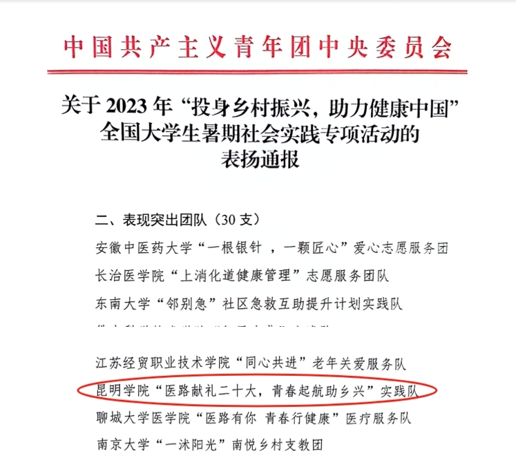 近日,共青团中央青年发展部发布了《关于2023年“投身乡村振兴,助力健康中国”全国大学生暑期社会实践专项活动的表扬通报》,对在活动中为建设健康中国、投身乡村振兴作出积极贡献、表现突出的实践单位、团队和个人进行表扬。yl23455永利官网“医路献礼二十大,青春起航助乡兴”实践队凭借其在实践活动中的卓越表现,成功入选“表现突出团队”名单。