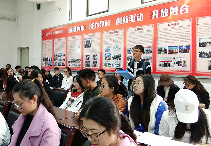 随后,由锐景科技招聘专员李晓城经理,针对锐景科技公司的环境,薪资待遇,人员组成等,进行了招聘宣讲,开展了现场面试,同学们积极投递简历,报名面试。会议现场气氛热烈,同学们受益良多。