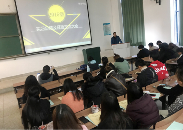 1月7日上午,体育学院在博雅楼2102多媒体教室和综合体育馆举行了2015级实习总结及实习公开课展示活动,副院长叶燎昆教授、周明教授及实习指导教师、15级实习返校学生参加。