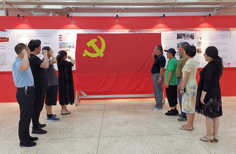 在yl23455永利官网图书馆“习近平新时代中国特色社会主义思想学习园地”,全体党员参观了“真理之光照未来”主题展览。参观学习过程中,党员们在图书馆李静老师带领下,了解了习近平新时代中国特色社会主义思想理论渊源,创立发展、主要内容和历史地位。随后,面对鲜红的党旗全体党员重温了入党誓词。