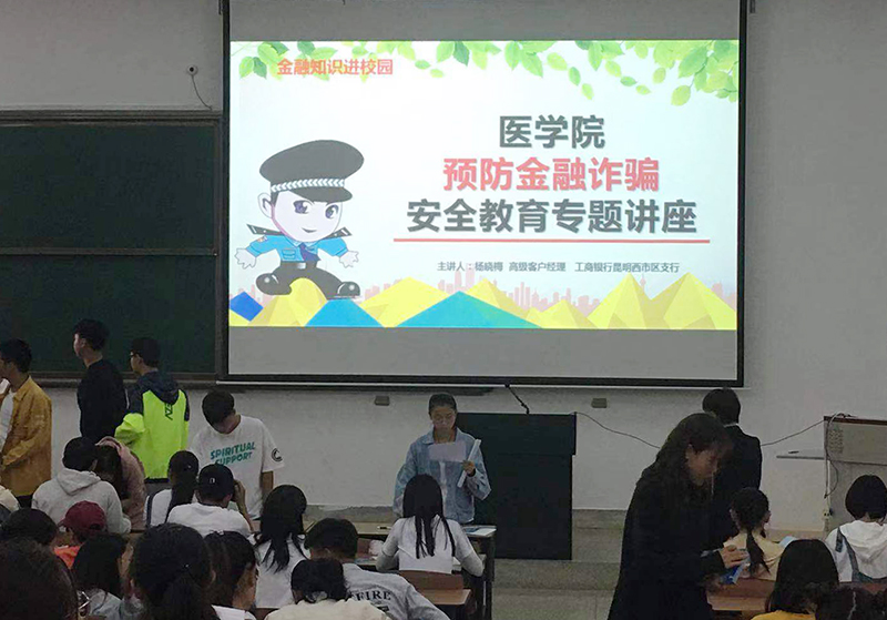1011日下午,在学校学生处的大力支持下,医学院邀请了中国工商银行昆明西市区支行高级客户经理、金融理财师杨晓梅为学生会干部、班干部、团干部、宿舍舍长及部分学生代表共计180多人进行《金融安全进校园,防范诈骗我帮忙》专题讲座。