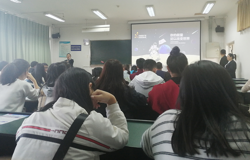 保山隆基硅材料有限公司是全球最大的单晶硅光伏产品制造商隆基绿能科技股份有限公司的全资控股子公司。保山隆基公司行政人事部经理杨春首先向参会同学介绍了云南省围绕“绿色能源牌”全力打造千亿水电硅材一体化产业的发展战略和新能源光伏发电技术和光伏产业。杨春经理从保山隆基公司的发展历程、企业荣誉、公司设备、企业文化、招聘岗位以及薪资待遇等方面对保山隆基公司进行了详细介绍,让同学们深入了解保山隆基公司的发展理念与战略。在讨论答疑环节,杨春经理就同学们提出的专业对口、工作环境、公司发展平台与机会等问题进行解答。宣讲会结束后,同学们纷纷向企业招聘负责人投递简历,报名参加现场面试。