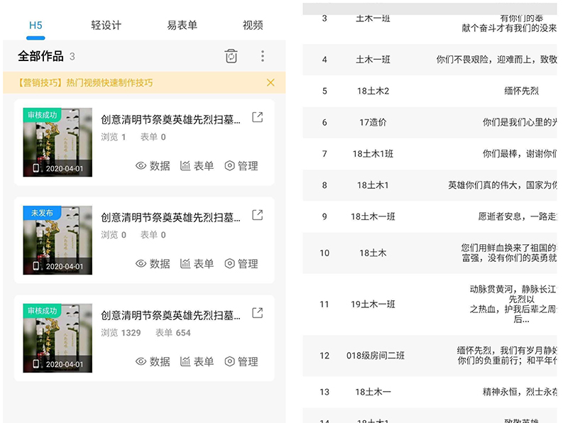 为了突出主题祭扫,学院围绕新冠肺炎疫情防控、抗战胜利75周年、志愿军入朝参战70周年等重要时间节点、重大事件,制作祭扫专题H5作品,发布“建工青年致敬英烈,励志报国”纪念回忆视频,大力宣传战斗在抗击疫情一线的医护人员,致敬疫情中的逆行英雄,大力宣传在中国革命、建设、改革历史进程中英勇献身烈士的感人事迹,传承和弘扬英烈精神,积极引导同学广泛参与英烈保护知识网络答题及感念寄语征集。活动中,共计参与学生1329名,收到感念寄语654条,收效甚佳。