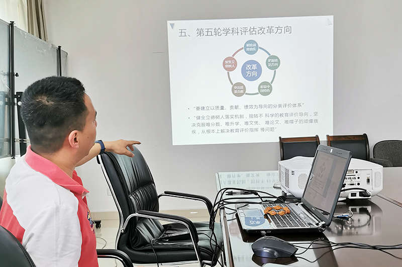 马宏老师结合自己到国家学位中心学习工作经验和参加第五轮学科评估培训会情况,以第四轮学科评估为个案,为支部党员系统讲解学科评估基本情况、评估背景、指导思想和指标体系,并重点介绍了第五轮学科评估改革方向、要求和思考。并同与会党员围绕我校学科评估问题展开讨论,对相关问题作了进一步深入解答。