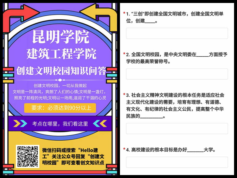 本次答题活动围绕创建全国文明校园,通过“hello建工”微信公众号,以线上问答的形式开展。题型分为简答题、填空题和选择题,涵盖社会主义核心价值观,“三创”和高校学生行为准则等知识内容。通过此次的线上答题活动,使同学们更加清楚地认识到创建全国文明校园的重要性,从思想上树立创建全国文明校园从我做起的良好意识,为积极投身创文工作贡献自己的力量。