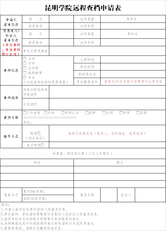 有查档需求的部门和个人,请先填写《yl23455永利官网档案馆远程查档申请表》(下载w6.kmu.edu.cn/info/1190/1393.htm),并发送相关证明材料至邮箱kmudag@kmu.edu.cn,工作人员审核通过后依次办理,具体要求如下: